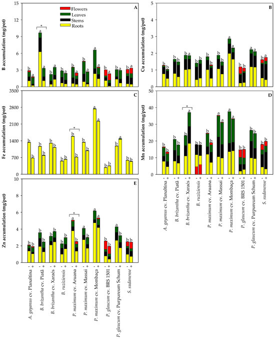 Accumulation of boron—B (A), copper—Cu (B), iron—Fe (C), manganese—Mn (D), and zinc—Zn (E) in the roots, stems, leaves, and flowers of grasses cultivated in non-polluted (-) and Cd-polluted (+) Oxisol. Different letters on the bars indicate significant differences between grass species within each Cd pollution condition (Scott–Knott test, p < 0.05), and asterisks (*) indicate significant differences at p < 0.05 between Cd pollution conditions within each grass species (ANOVA, t-test).