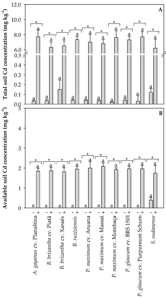 Total (A) and Mehlich-1 extractable soil Cd concentrations (B) measured in non-polluted (-) and Cd-polluted (+) Oxisol at the end of the experiment. Different letters on the bars indicate significant differences between grass species within each Cd pollution condition (Scott–Knott test, p < 0.05), and asterisks (*) indicate significant differences at p < 0.05 between Cd pollution conditions within each grass species (ANOVA, t-test).