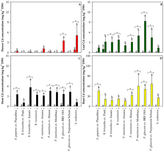 Cadmium concentrations in the flowers (A), leaves (B), stems (C), and roots (D) of grasses cultivated in non-polluted (-) and Cd-polluted (+) Oxisol. Different letters on the bars indicate significant differences between grass species within each Cd pollution condition (Scott–Knott test, p < 0.05), and asterisks (*) indicate significant differences at p < 0.05 between Cd pollution conditions within each grass species (ANOVA, t-test).