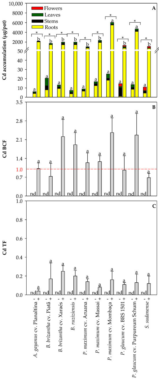 Cadmium accumulation in the root, stems, leaves, and flowers (A), Cd bioconcentration factor—Cd BCF (B) and Cd translocation factor—Cd TF (C) of grasses cultivated in non-polluted (-) and Cd-polluted (+) Oxisol. Different letters on the bars indicate significant differences between grass species within each Cd pollution condition (Scott–Knott test, p < 0.05), and asterisks (*) indicate significant differences at p < 0.05 between Cd pollution conditions within each grass species (ANOVA, t-test). nd: non-determined.
