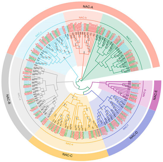 To determine the evolutionary relationship of NAC genes among moso bamboo, Arabidopsis and rice, the conserved domains of 279 NAC genes (141 PheNACs of moso bamboo, 75 AtNACs of Arabidopsis, 64 OsNACs of rice) with complete NAM domains were subjected to multiple sequence alignment. According to the results of Fang et al. [29], The NACs were classified into five groups (NAC-A–NAC-E) or seven subgroups (NAC-a–NAC-g) based on the topology of the neighbor-joining (NJ) tree constructed by MEGA 7 (Figure 1). The NAC-A group, with the most significant number of 118 members, comprised the NAC-a, NAC-b, and NAC-c subgroups. Beyond that, each group comprised only one subgroup, namely, NAC-B/NAC-d, NAC-C/NAC-e, NAC-D/NAC-f, and NAC-E/NAC-g. The low support rate of these subgroups was expected for the NAC family due to the variable transcriptional regulation region at the C-terminus, as shown in previous research [29]. However, low-level branches showed relatively high bootstrap values, indicating the conservative evolution of subgroup genes.