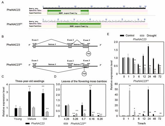 The analysis of NAM domain, intron/exon structure and expression patterns of PheNAC23 and PheNAC23ES. (A) NAM domain analysis; (B) The intron/exon structure of PheNAC23 and PheNAC23ES; (C) Expression patterns of PheNAC23 and PheNAC23ES in leaves of three-year-old seedlings; (D) Expression patterns of PheNAC23 and PheNAC23ES in leaves of the flowering moso bamboo; 4.26–6.26: dates of sample collection (26 April, 26 May, 7 June, 16 June, and 26 June); 4.26: floral bud formation stage; 5.26 and 6.7: inflorescence growing stage; 6.16: bloom stage; 6.26: embryo formation stage. (E) Expression levels of PheNAC23 and PheNAC23ES under PEG treatment. The relative expression at 0 h was normalized to 1; values represent the mean ± SE from three biological replicates. * p < 0.05, ** p < 0.01.