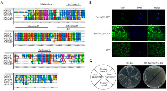 Characterization of PheNAC23 and PheNAC23ES protein sequences, subcellular localization and transcriptional activation analysis. (A) The multiple sequence alignment of four PheNACs belonging to the NAP subgroup, ANAC019 in Arabidopsis, PheNAC23 and PheNAC23ES; NLS: nuclear localization signal. (B) Confocal images of subcellular localizations of PheNAC23 and PheNAC23ES in Nicotiana benthamiana (tobacco) leaf epidermal cells; expression of the PheNAC23-GFP and PheNAC23ES-GFP fusion protein was examined after 3 d by fluorescence and light microscopy; 4′,6-diamidino-2-phenylindole (DAPI) was used to stain the cell nucleus; bar, 20 μm. (C) Transcriptional activation analysis of PheNAC23 and PheNAC23ES fused with the GAL4 DNA-binding domain in yeast. The positive control is pGBKT7-53 + pGADT7-T; the negative control is the empty pGBKT7 vector. X-α-Gal tests the expression of α-galactosidase.