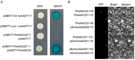 It was reported that NAC proteins can function as homodimers or heterodimers in plant cells [7]. Therefore, we explored whether PheNAC23ES can function as the heterodimer of PheNAC23. We found that PheNAC23ES could interact with PheNAC23 by yeast two-hybrid (Y2H) assay (Figure 4A). The protein–protein interaction of PheNAC23ES and PheNAC23 was further verified by the bimolecular fluorescence complementation (BiFC) assay in the tobacco transient transformation system. The results of the BiFC assay showed that YFP signals could be detected in the nucleus after transformation of PheNAC23 and PheNAC23ES, whereas YFP signals could not be detected in the nucleus of control experimental group cells (Figure 4B), so PheNAC23ES formed a heterodimer with PheNAC23.