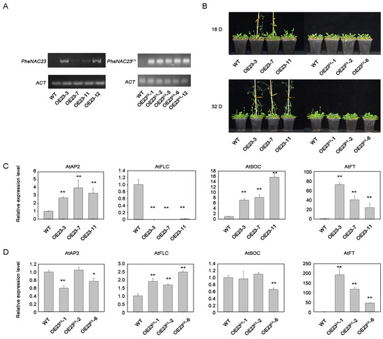 Overexpression of PheNAC23 and PheNAC23ES promotes/delays flowering in Arabidopsis. (A) RT-PCR confirmed the relative expression levels of PheNAC23 and PheNAC23ES in overexpression lines. OE23-3, OE23-7, OE23-11 and OE23-12 were four independent lines that overexpressed PheNAC23. OE23ES-1, OE23ES-2, OE23ES-5, OE23ES-6 and OE23ES-12 were five independent lines that overexpressed PheNAC23ES. (B) Morphology of Arabidopsis plants overexpressing PheNAC23 and PheNAC23ES at flowering stage. (C,D) Analysis of relative expression levels of flowering-related genes in transgenic Arabidopsis lines and WT. Asterisks indicate that the value is significantly different from that of the WT at the same time point (* p < 0.05, ** p < 0.01).