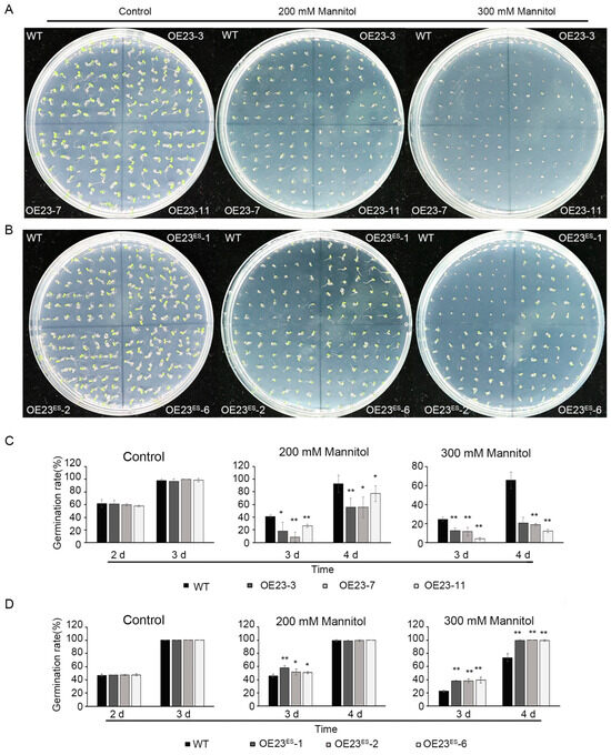 Seed germination of PheNAC23- and PheNAC23ES-overexpressing Arabidopsis under mannitol. (A,B) Photographs were taken 4 days after mannitol treatment. (C,D) The germination rate was determined at 2–4 days after mannitol treatment. WT, wild-type Arabidopsis; OE23-3, OE23ES-7, and OE23ES-11, three independent lines overexpression of PheNAC23ES; OE23ES-1, OE23ES-2, and OE23ES-6, three independent lines overexpression of PheNAC23ES; The experiments were repeated three times with similar results. Asterisks indicate the significant difference between WT and PheNAC23- or PheNAC23ES -overexpressing Arabidopsis, * p < 0.05 and ** p < 0.01); error bars indicate the ± SE.