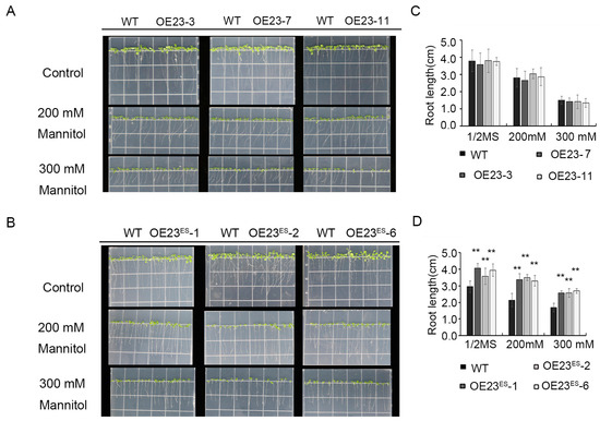 A root length phenotype was surveyed ten days after planting the seedlings on the medium (Figure 7). The average taproot lengths of PheNAC23ES-overexpression lines were 3.95 ± 0.04 cm, 3.39 ± 0.04 cm, and 2.61 ± 0.04 cm on 1/2 MS supplied with 0 mM, 200 mM and 300 mM mannitol, respectively, which was significantly longer than for WT (Figure 7B,D). Although the root length of the PheNAC23-overexpression lines was inhibited by mannitol treatment, it was comparable to WT (Figure 7A,C). This indicated that PheNAC23ES improved the drought tolerance of Arabidopsis, while PheNAC23 did not, even adversely affecting the seed germination under stress conditions.