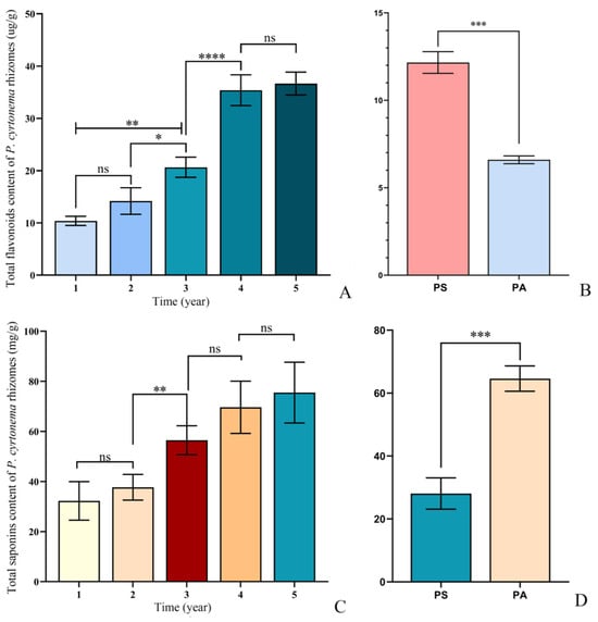 Total flavonoid content and total saponin content in P. cyrtonema rhizomes. (A), Total flavonoid content in five age sections; (B), total flavonoid content in entire rhizomes in spring and autumn; (C), total saponin content in five age sections; (D), total saponins content in entire rhizomes in spring and autumn. The letters PS and PA refer to the rhizomes harvested in spring and autumn, respectively. The abbreviated ns represents no significant difference. ****, ***, **, and * represent statistically significant at p < 0.0001, p < 0.001, p < 0.01, and p < 0.05, respectively.