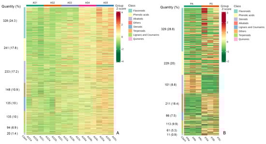 Basic information on secondary metabolites detected from P. cyrtonema rhizomes. (A), Clustered heatmap of secondary metabolites in samples of one-year-old age sections (AS1 group), two-year-old age sections (AS2 group), three-year-old age sections (AS3 group), four-year-old age sections (AS4 group), and five-year-old age sections (AS5 group); (B), clustered heatmap of secondary metabolites in samples of spring rhizome (PS group) and autumn rhizome (PA group). The shades of color indicate the quantity of metabolites, with redder shades representing more and greener shades representing fewer.