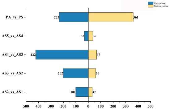 Multivariate statistical analyses were performed according to the previously published method used by our laboratory [42]. Briefly, metabolite data were log2-transformed and underwent autoscaling before any statistical analysis. Metabolite data from the AS1, AS2, AS3, AS4, and AS5 samples and from the PS and PA samples were used for unsupervised principal component analysis (PCA), hierarchical clustering analysis (HCA), and orthogonal partial least squares discriminant analysis (OPLS-DA) by using the Metware Cloud [https://cloud.metware.cn (accessed on 10 January 2024)]. OPLS-DA analysis referred to a previously published method by [47].