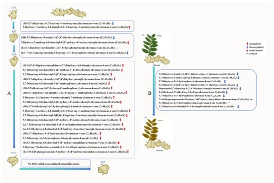 The significantly different secondary metabolites were considered as differential accumulated secondary metabolites (DASMs) within each pair of comparison groups based on fold change ≥ 2.0 [log2 (2) ≥ 1.0] or ≤0.5 [log2 (0.5) ≤ − 1] and VIP ≥ 1.0 as the screening standards. A total of 133 DASMs (101 upregulated and 32 downregulated) were detected from AS2 vs. AS1, 262 DASMs (202 upregulated and 60 downregulated) from AS3 vs. AS2, 489 DASMs (422 upregulated and 67 downregulated) from AS4 vs. AS3, 43 DASMs (32 upregulated and 11 downregulated) from AS5 vs. AS4, and 594 DASMs (233 upregulated and 361 downregulated) from PA vs. PS (Figure 3). The detailed information on the top 20 DASMs with maximum values of log2 (fold change) in each pair of comparison groups is listed in Table 1. Figure 3 shows that most DASMs detected from the interannual pairwise comparisons of AS2 vs. AS1, AS3 vs. AS2, and AS4 vs. AS3 were upregulated. Meanwhile, nearly equal quantities of up- and downregulated DASMs (32 and 37) were detected from the comparison of AS5 vs. AS4. However, in the seasonal comparison of PA vs. PS, much more downregulated DASMs (361) were detected than upregulated DASMs (233). In addition, a total of 31 flavonoids in the flavonoids class were identified as homoisoflavonoids. Among them, 20 were upregulated in the comparison of AS4 vs. AS3; no differential accumulated homoisoflavonoids were found in the comparison of AS5 vs. AS4; 10 were downregulated in the comparison of PA vs. PS (Figure 4). The detailed information on differential accumulated flavonoids and steroids in the five comparison groups is listed in Table 2.