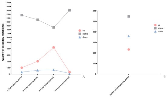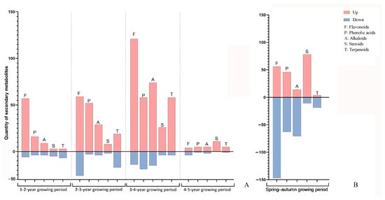 A line graph and a scatter plot were created based on the changes in composition and abundance of secondary metabolites in P. cyrtonema rhizomes, respectively. They were established to further describe the interannual variation in these rhizomes during the entire five-year growth period and their seasonal variation from spring to autumn (Figure 5A,B). The upregulated DASMs in the interannual rhizome samples exhibited a continuously increasing trend from the first year; then, they reached a maximum quantity of 422 (31.35%) by the fourth year; subsequently they decreased to a minimum quantity of 32 (2.38%) by the fifth year (Figure 5A). Among them, the most significantly increased compounds were flavonoids; they were followed by phenolic acids, alkaloids, and terpenoids; steroids were the least increased compounds (Figure 6A). Compared with the variation in the abundant upregulated DASMs, the variation in a small amount of downregulated DASMs was less obvious during the entire five-year growth period. This variation trend based on interannual DASMs is consistent with that from the comparative analysis on the total flavonoid content and total saponin content in five-year-old P. cyrtonema rhizomes. Accordingly, the finding indicates an increasing accumulation trend in functional components with progressing growth years. The most active interannual accumulation occurred from the three- to four-year growth period, which suggests that the four-year-old P. cyrtonema rhizomes had the most superior quality compared with rhizomes of other ages.