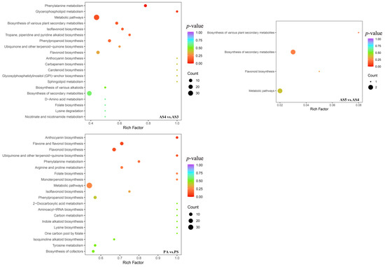 The top 20 significantly enriched KEGG pathways identified from AS4 vs. AS3, AS5 vs. AS4, and PS vs. PA. The color of dots in plots refers to higher or lower p-values, with bluer shades representing higher and redder shades representing lower. The size of a dot represents more or fewer secondary metabolites, with larger dots representing more and smaller dots representing fewer.