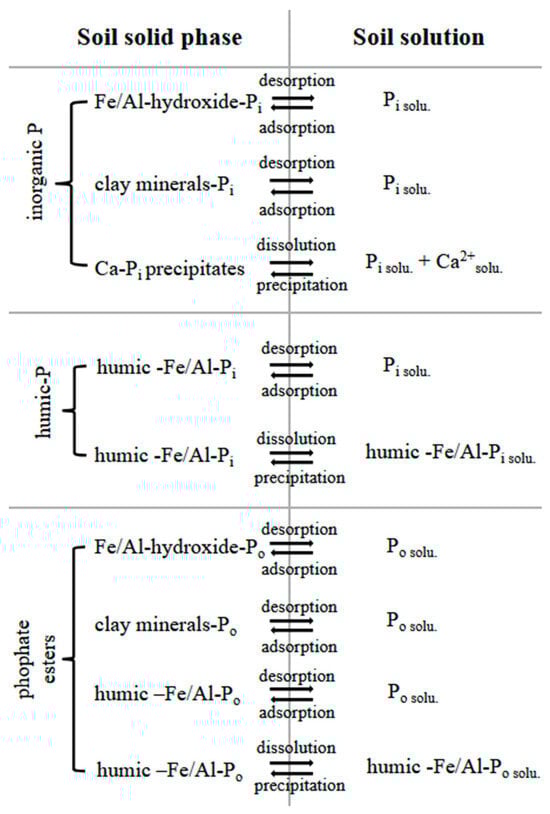 Phosphate at the soil solid phase, P transfer into the soil solution and immobilization reactions affecting soil P availability. Pi—orthophosphate; Po—phosphate ester, solu.—species in solution.
