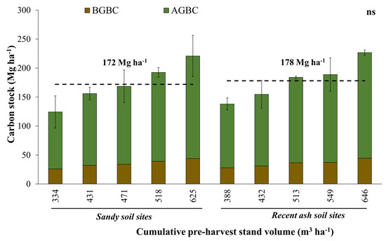 Aboveground biomass carbon stock (AGBC) and belowground biomass carbon stock (BGBC) at each site by soil type and cumulative over bark stand volume at harvesting age. The dashed lines represent the average total biomass carbon stock for sandy and recent volcanic ash soil sites. Error bars indicate standard deviations for each site (n = 3).