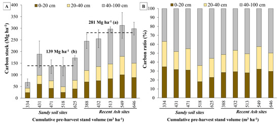 (A) Soil carbon stock up to 1 m depth; and (B) proportion of carbon for each soil depth, at each site by soil type and cumulative over bark stand volume at harvesting age. The dashed lines represent the average values of soil organic carbon stock for sandy and recent volcanic ash soil sites. In (A), differences between soil type means are indicated by lowercase letters and error bars represent standard deviations for each site (n = 3).