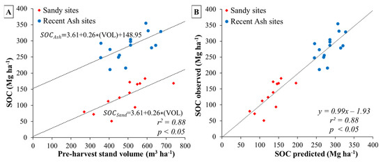 (A) Relationship between site productivity (cumulative over bark stand volume at harvesting age, VOL) and organic carbon stock in the mineral soil (up to 1 m deep) (SOC) using soil type as the dummy variable; and (B) relationship between observed SOC and predicted SOC estimated using the dummy variable regression adjusted model.
