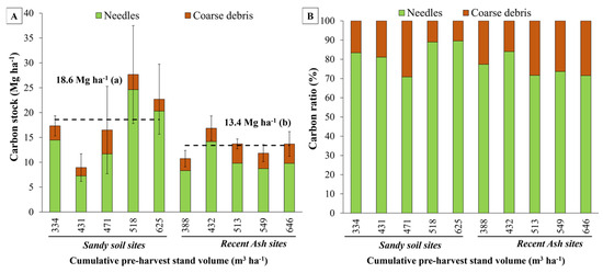 (A) Forest floor carbon stock in organic horizons and coarse woody debris; and (B) proportion of carbon stock in forest floor and coarse woody debris at each site by soil type and cumulative over bark stand volume at harvesting age. The dashed lines represent the average value of forest floor carbon stock for sandy and recent volcanic ash soil sites. In (A), differences between soil type means are indicated by lowercase letters and error bars represent standard deviations for each site (n = 3).