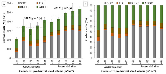 (A) Total carbon stock for soil organic carbon (SOC), forest floor carbon (FFC), belowground biomass (BGBC), and aboveground biomass (ABGC); and (B) proportion of total site carbon stock at each site by soil type and cumulative over bark stand volume at harvesting age. The dashed lines represent the average value of total carbon stock for sandy and recent volcanic ash soil sites. In (A), differences between soil type means are indicated by lowercase letters and error bars represent standard deviations for each site (n = 3).