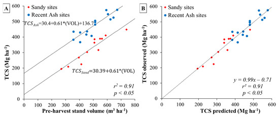 (A) Regression models of the relationship between cumulative over bark stand volume at harvesting age (VOL) and total site carbon stock (TCS), considering soil type as a dummy variable; and (B) relationship between observed and predicted TCS using the dummy variable model.