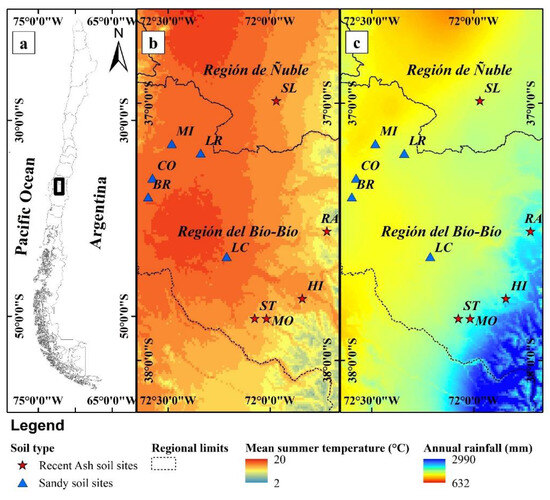 (a) Study area in Central South Chile, (b) Study area and site locations’ mean summer (January to March) temperature (°C), (c) Study area and site locations’ mean annual rainfall (mm yr−1) (site code name is presented in Table 5).