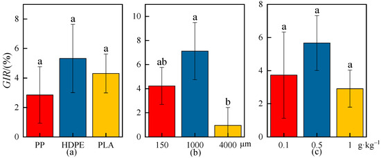 GIR of wheat seeds under the CK and different microplastic characteristics. (a) Microplastic types. (b) Microplastic particle sizes. (c) Microplastic concentrations. All data are presented as the mean ± SD (n ≥ 3 biological replicates). Lowercase letters above bars indicate significant differences according to the post hoc Fisher LSD test (p < 0.05).