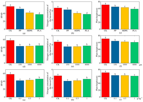 Effects on wheat plant growth (SPAD, nitrogen concentration of the leaves, and plant height) under the CK and different microplastic characteristics. (a–c) Microplastic types. (d–f) Microplastic particle sizes. (g–i) Microplastic concentrations. All data are presented as the mean ± SD (n ≥ 3 biological replicates). Lowercase letters above bars indicate significant differences according to the post hoc Fisher LSD test (p < 0.05).