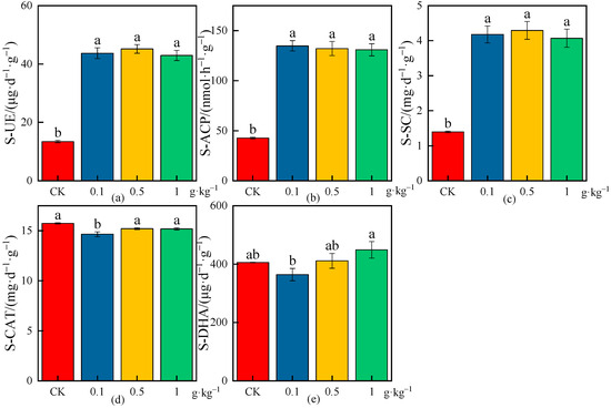 Effects on enzymatic activities of wheat rhizosphere soil under the CK and different microplastic concentrations. (a) S-UE, (b) S-ACP, (c) S-SC, (d) S-CAT, and (e) S-DHA. All data are presented as the mean ± SD (n ≥ 3 biological replicates). Lowercase letters above bars indicate significant differences according to the post hoc Fisher LSD test (p < 0.05).