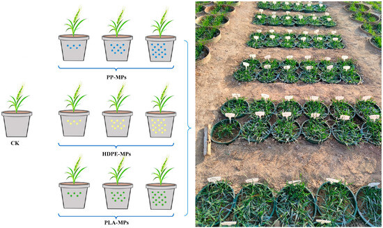 In August 2020, test soil was collected from the sandy soil (0~20 cm) in the farmland layer around the Agricultural Water Soil Environmental Field Research Station of Xinxiang, Chinese Academy of Agricultural Sciences. The soil was naturally air-dried to screen out the visible animal and plant residues, stones, etc., and then the soil was screened with a 5 mm screen for use. The basic physicochemical properties of the tested soil and the abundance of MPs were as follows: the main composition of soil particle sizes was 6.85% less than 0.002 mm, 52.61% from 0.002 to 0.02 mm, and 40.54% from 0.02 to 2.0 mm; the texture of the soil tested was sandy loam, the dry volume mass was 1.45 g·cm−1, pH value was 7.89, the TN concentration was 0.752 g·kg−1, the TP concentration was 0.603 g·kg−1, the OM concentration was 24.14 g·kg−1, the EC was 163.90 μS·cm−1, the NH4+ concentration was 0.003 g·kg−1, the NO3− concentration was 0.294 g·kg−1, and the abundance of MPs was 12 n·kg−1. The soil particle size was determined by laser particle size analyzer, the dry volume mass was measured by the cutting ring method, the pH value was determined by a glass electrode pH meter (sod–water ratio 1:2.5), the concentrations of NH4+, NO3−, TN, and TP were determined by a continuous-flow analyzer (Auto Analyzer 3 produced by BRAN + LUEBBE, Hamburg, Germany), EC was determined by a conductivity meter, OM was determined by potassium dichromate oxidative external heating method, and the abundance of MPs was identified by an Agilent 8700 laser direct infrared (Agilent 8700 produced by Agilent Technologies Inc., Santa Clara, CA, USA; LDIR) chemical imaging system; refer to the references for the specific steps [68,69,70].