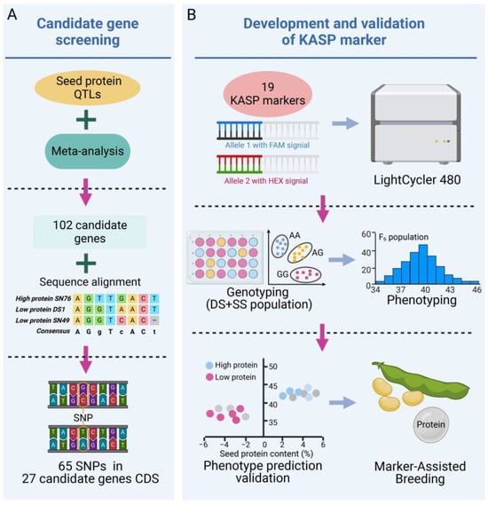 Flowchart for KASP marker development, genotyping, and phenotype prediction validation based on candidate genes for soybean seed protein content. (A) Screening of candidate genes for seed protein content. (B) Development and validation of KASP markers.