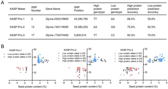 Seed protein content is a critical trait in soybean breeding, as it provides a primary source of high-quality protein for both human consumption and animal feed. This study aimed to enhance molecular marker-assisted selection for high-protein soybean varieties by developing Kompetitive Allele-Specific Polymerase Chain Reaction (KASP) markers targeted at loci associated with seed protein content. Nineteen markers with high genotyping efficacy were identified through screening. Utilizing SN76 (a high-protein line) as the male parent and SN49 and DS1 (both low-protein lines) as female parents, 484 F6 generation individuals from these hybrid combinations were selected to validate the predictive accuracy of the 19 KASP markers. Notably, KASP-Pro-1, KASP-Pro-2, and KASP-Pro-3 effectively distinguished genotypes associated with high and low protein content, with prediction accuracies of 68.4%, 75.0%, and 83.3%, respectively. These results underscore the reliability and practical utility of the selected molecular markers, which are located within the genes Glyma.03G219900, Glyma.14G119000, and Glyma.17G074400, respectively. Haplotype analysis and gene pyramiding indicate that these three genes may influence seed protein content. Consequently, these KASP markers can be effectively integrated into genetic and genomic research on soybean seed protein content as well as into marker-assisted breeding.