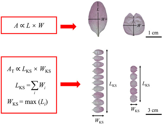Montgomery [18] proposed a proportional relationship between the leaf area and the product of leaf length and width; the equation came to be known as the Montgomery equation (ME), and its validity has been verified for the leaves of broad-leaved monocot and eudicot species [16,17,18,19,20]. The ME was used to test whether the empirically determined petal area (A) had a proportional relationship with the petal length (L) and width (W), i.e.,