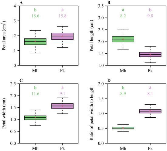 Boxplots of (A) petal area, (B) petal length, (C) petal width, and (D) the ratio of petal width to length for the two Rosaceae species. The upper and lower borders of each box represent the 3/4 and 1/4 quantiles, respectively. Significant differences between the species are indicated by the colorful letters a and b in each panel, based on the HSD test (α = 0.05). The horizontal bold lines in the boxes represent the medians, and the asterisks represent the means. Mh represents M. halliana var. Parkmanii, and Pk represents P. × kanzakura cv. Kawazu-zakura.