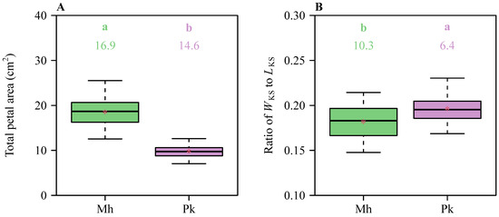Boxplots of (A) the total petal area per flower and (B) the ratio of the maximum petal length to the sum of the petal widths per flower for the two Rosaceae species. The upper and lower borders of each box represent the 3/4 and 1/4 quantiles, respectively. Significant differences between the species are indicated by the colorful letters a and b in each panel, based on the HSD test (α = 0.05). The horizontal bold lines in the boxes represent the medians, and the asterisks represent the means. Mh represents M. halliana var. Parkmanii, and Pk represents P. × kanzakura cv. Kawazu-zakura.