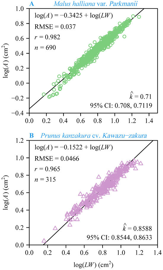 Results of fitting the Montgomery equation on a log–log scale for M. halliana var. Parkmanii (A), and P. × kanzakura cv. Kawazu-zakura (B). In each panel, A, L, and W are the petal area, length, and width, respectively; RMSE is the root-mean-square error; n is the total number of petals for each species; is the estimated Montgomery parameter; 95% CIs are the 95% confidence intervals of the Montgomery parameter based on 3000 bootstrap repetitions.