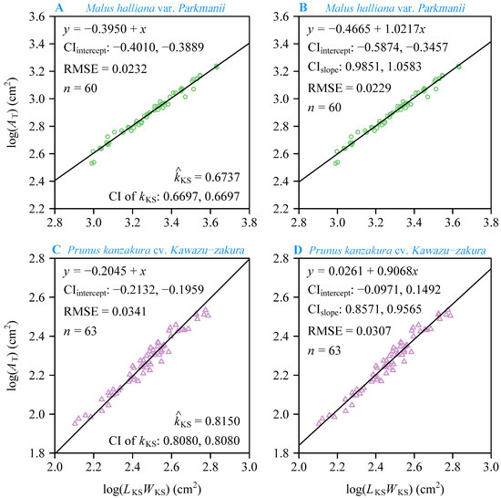 Results of fitting the Montgomery–Koyama–Smith equation and the power-law equation for the relationship between the total petal area per flower (AT) and the product of the sum of petal widths and the maximum petal length per flower (LKSWKS) on a log–log scale for M. halliana var. Parkmanii (A,B) and P. × kanzakura cv. Kawazu-zakura (C,D). The icons represent the observations converted on the log–log axis; CIintercept is the 95% confidence interval of the intercept; CIslope is the 95% confidence interval of the slope; RMSE is the root-mean-square error of the linear fitting; and n is the number of flowers for each species. In panels (A,C), KS is the estimate of the proportionality coefficient of the MKSE, and the CI of represents the 95% confidence interval of the proportionality coefficient.