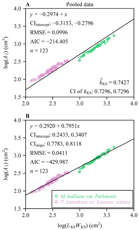 Results of fitting the Montgomery–Koyama–Smith equation (A) and the power-law equation (B) for the relationship between the total petal area per flower (AT) and the product of the sum of petal widths and the maximum petal length per flower (LKSWKS) on a log–log scale for the pooled data of the two Rosaceae species. The icons are the observations converted on the log–log axis; CIintercept is the 95% confidence interval of the intercept; CIslope is the 95% confidence interval of the slope; RMSE is the root-mean-square error of the linear fitting; and n is the total number of flowers of the two species. In panel (A), KS represents the estimate of the proportionality coefficient of the MKSE, and the CI of represents the 95% confidence interval of the proportionality coefficient.