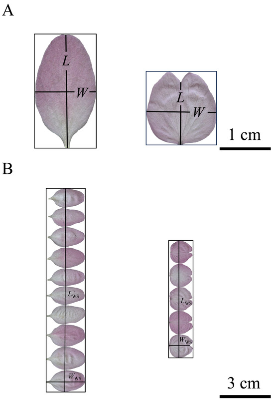We carefully separated the petals from each flower, scanned them using a photo scanner (V550, Epson Indonesia, Batam, Indonesia), and saved them in the .jpg format at 600 dpi resolution. Then, Adobe Photoshop 2021 (version 22.4.2; Adobe Systems Incorporated, San Jose, CA, USA) was used to obtain black-and-white images of the petal boundaries that were saved as bitmap images at 600 dpi resolution. A Matlab (version ≥ 2009a; MathWorks, Natick, MA, USA) procedure developed by Shi et al. [30] and Su et al. [31] was used to obtain the planar coordinates of each petal boundary by counting the pixel values of each image. We used the “bilat” function in the “biogeom” package (version 1.3.5; Shi et al.) [32] based on the R software (version 4.3.2; R Core Team, 2023) [33] to calculate the petal area, length, and width (see Figure 1 for the definition of the length and width of the petals of the two species). Based on Koyama and Smith’s method [26] for calculating the total leaf area in a shoot, we separated all the petals from the flower’s receptacle and placed them side by side on a flat plane, as shown in Figure 1. The total petal area per flower (denoted as AT), the sum of individual petal widths (denoted as LKS), and the maximum individual petal length (denoted as WKS) were calculated according to the definitions of Koyama and Smith [26], as illustrated in Figure 1. Here, the subscript “KS” is the acronym of the family names of Koyama and Smith.