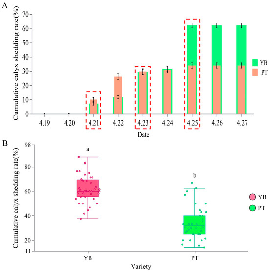 Cumulative calyx abscission rate of YB and PT at different stages. (A) is the statistical result of the cumulative calyx shedding rate of YB and PT, and (B) is the final cumulative calyx shedding rate of YB and PT. The data of figure (A,B) are expressed as mean ± SD with at least 40 biological replicates. The a and b in figure (B) indicate that there are significant differences between the two groups. The red dotted line frame indicates the three critical periods of calyx tube shedding.