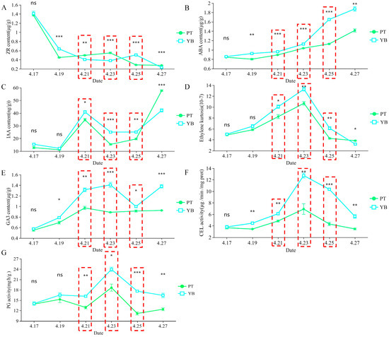 The change trend of physiological index values in the abscission zone of YB and PT variety during calyx shedding. (A) is zeatin (tZR), (B) is abscisic acid (ABA), (C) is auxin (IAA), (D) is ethylene (Eth), (E) is gibberellin (GA3), (F) is cellulase (CEL), (G) is polygalacturonase (PG). The t-test was used for statistical analysis, and the data are expressed as mean ± standard error of three biological replicates. The asterisk, double asterisk and triple asterisk indicate significant differences at the p < 0.05, p < 0.01 and p < 0.001 levels, respectively. The red dotted line frame indicates the three critical periods of calyx tube shedding. ns indicates that there is no significant difference between the two varieties.