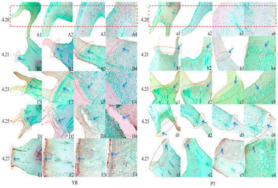 Microscopic observation of calyx tube abscission zone of YB and PT varieties. (A1–E4) are the microscopic observation results of the abscission zone of the calyx tube shedding process of the YB variety, and the left column number represents the date. (a1–e4) represent the result map of PT variety, and a column of numbers on the left represents the date. YB varieties are represented by uppercase letters. (A1,B1,C1,D1,E1) are images under the objective of 2.5×; (A2,B2,C2,D2,E2) are the pictures under 5× objective lens; (A3,B3,C3,D3,E3) are 10× objective lens images; (A4,B4,C4,D4,E4) are pictures under 20× objective lens. The PT variety is represented by lowercase letters, and the size of the picture objective is the same as that of the YB variety. The red rectangular dashed box indicates that no separation layer cells are formed. The red oval frame indicates the location of the detached cells.