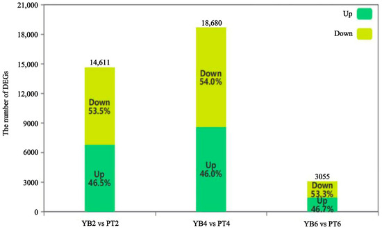 To identify the genes that are related to calyx shedding, the two varieties were compared in the early, middle, and late stages of calyx shedding, with results showing 14,611 DEGs for YB2vsPT2 with 6787 upregulated genes and 7824 downregulated genes in the early shedding stage; 18,680 DEGs for YB4vsPT4 with 8599 upregulated genes and 10,081 downregulated genes during the middle stage; and 3055 DEGs for YB6vsPT6 with 1427 upregulated genes and 1628 downregulated genes at the end of abscission (Figure 4). The highest number of DEGs was therefore observed in the middle of shedding, with the obvious differences observed at this stage suggesting dramatic changes at the molecular level. The comparative combination of large numbers of DEGs is obviously more meaningful for data mining. The results obtained indicate that the mid-shedding stage may be a critical period during which the calyx removal rates are affected in both varieties.
