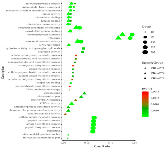 GO enrichment analysis of YB and PT differentially expressed genes at different shedding stages of calyx tube. The abscissa in the figure is the ratio of the number of differentially expressed genes enriched in the GO pathway to the total number of differentially expressed genes; the ordinate is GO enrichment pathway; the size of the point represents the number of genes enriched in the GO pathway; the color from green to red represents the significant size of the enrichment, and the closer to the green, the smaller the significance; different shapes represent different comparison combinations. The circle is YB2vsPT2 (initial shedding), the triangle is YB4vsPT4 (mid-shedding stage), and the square is YB6vsPT6 (late stage of shedding).