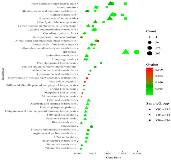 KEGG enrichment analysis of YB and PT differentially expressed genes at different abscission stages of calyx tube. The abscissa in the figure is the ratio of the number of differentially expressed genes annotated to the KEGG pathway to the total number of differentially expressed genes; the ordinate is the KEGG pathway; the size of the point represents the number of genes annotated to the KEGG pathway; the color from green to red represents the significant size of the enrichment, and the closer to the green, the smaller the significance; different shapes represent different comparison combinations. The circle is YB2vsPT2 (initial shedding), the triangle is YB4vsPT4 (mid-shedding stage), and the square is YB6vsPT6 (late stage of shedding).