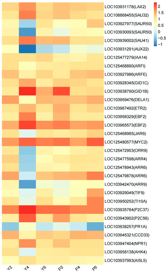 Based on this classification, 14 genes are category 1: auxin transporter-like protein (LOC103931178), auxin-responsive protein (LOC108868455, LOC103939002), ethylene receptor (LOC103967492), gibberellin receptor (LOC103928345, LOC103938790), EIN3-binding F-box protein (LOC103958329, LOC103965573), transcription factor MYC2 (LOC125480577), protein phosphatase 2C (LOC103935784, LOC103943902), basic form of pathogenesis-related protein (LOC103938257), BTB/POZ domain and ankyrin repeat-containing protein NPR1 (LOC103947404), and bZIP transcription factor (LOC103937993). The expression levels of these 14 genes were significantly higher in Y4 than P4 (Figure 7). In addition, 16 genes belong to category 2: auxin-responsive protein (LOC103927977, LOC103930093), auxin-induced protein (LOC103931291), auxin response factor (LOC125468890, LOC103927986), DELLA protein (LOC103959476), jasmonoyl-L-amino acid synthetase (LOC125468985), two-component response regulator (LOC125472953, LOC125477598, LOC125478943, LOC125479878, LOC103942470), protein TIFY (LOC103929049, LOC103950252), D3-1 cyclin-D3-1 (LOC103945321), and histidine kinase (LOC103958138). The expression levels of these 16 genes were lower in Y4 than in P4 (Figure 7).