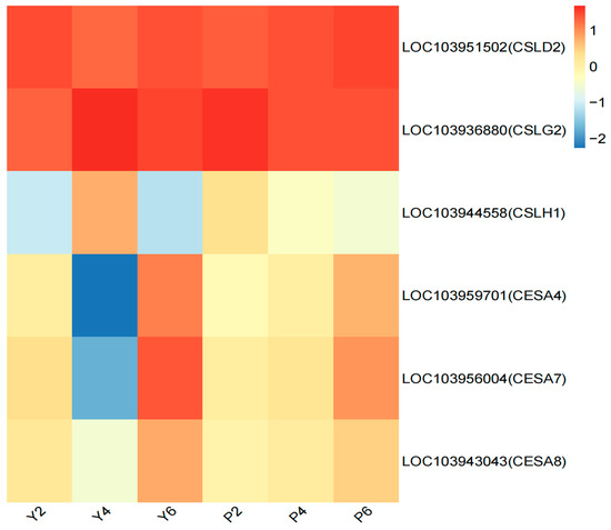 Expression patterns of genes related to the functional pathway of cellulose synthase activity. The abscissa is the sample name, and the ordinate is the gene name. The closer the color is to red, the higher the expression is. The initial sample of calyx tube shedding (Y2, P2); mid-shedding samples (Y4, P4); samples at the end of shedding (Y6, P6).