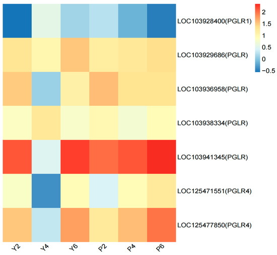 Expression patterns of genes related to polygalacturonase activity functional pathway. The abscissa is the sample name, and the ordinate is the gene name. The closer the color is to red, the higher the expression is. The initial sample of calyx tube shedding (Y2, P2); mid-shedding samples (Y4, P4); samples at the end of shedding (Y6, P6).