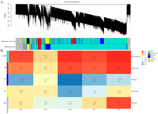 To further explore the genes related to calyx shedding, the transcriptome data of 18 samples obtained during calyx shedding were subjected to WGCNA. After filtering out gene data with an expression level of 0, the remaining 27,963 genes, of which the top 2000 genes had the largest average absolute deviation, were used to construct a weighted gene co-expression network. Because no genes that are directly related to tZR and the plant hormone signal transduction pathways were found in the results of the gene expression patterns (Figure 7), tZR was not considered a phenotypic physiological index for WGCNA. According to the literature, ABA is not directly involved in the shedding of plant organs but only induces organs to enter senescence in advance. ABA can stimulate the production of Eth, and the real shedding process is caused by Eth rather than ABA [39]. ABA was also not considered a phenotypic marker for the WGCNA in this study. Additionally, salicylic acid (SA) and jasmonic acid (JA) are related to plant resistance and defense [40]; therefore, these two physiological indicators were not considered. Five physiological indicators were selected: GA3, IAA, ETH, PG, and CEL, which are closely related to calyx shedding and were therefore used as phenotypic data for WGCNA.