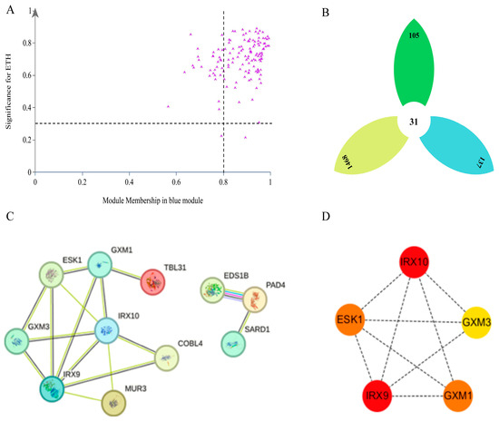 Further determination of the core and key core genes in the module indicated 105 core genes (Figure 11A) and 31 key core genes (Figure 11B) in the blue module that are significantly negatively correlated with Eth. To further narrow the range of key core genes, the eight key core genes annotated as Eth-related or Eth-induced from the 31 key core genes (C7317, PIP22, SAUR50, EIX2, SUS, ALE2, MA658, PER64) were identified. Protein interaction network (PPI) analysis of the 105 core genes in the blue module (Figure 11C) revealed that 11 of the genes interact with each other. The use of the CytoHubba plug-in in Cytoscape for further analysis (Figure 11D) revealed five core genes with high connectivity (IRX10, IRX9, ESK1, GXM1, GXM3), with the highest MCC scores observed for IRX10 and IRX9.