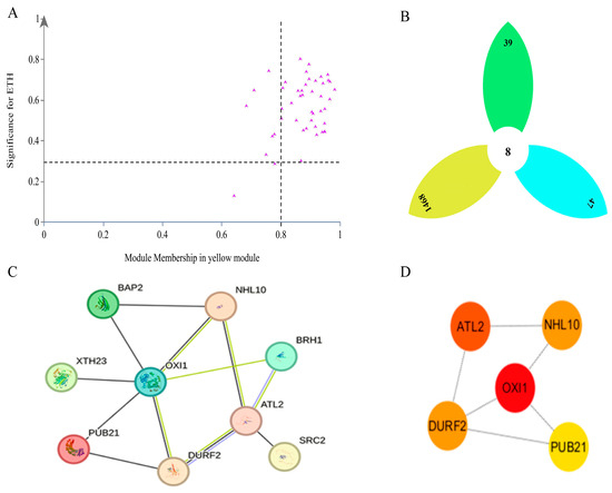 We also found thirty-nine core genes (Figure 12A) and eight key core genes (Figure 12B) in the yellow module that were significantly negatively correlated with Eth. To further narrow the range of the key core genes, two key core genes (M3K20 and FB316) annotated as Eth-related or Eth-induced were found among the eight key core genes. PPI analysis of the thirty-nine core genes in the yellow module indicated nine interacting genes (Figure 12C), and further analysis with Cytoscape (Figure 12D) indicated five key core genes with high connectivity (OXI1, ATL2, DURF2, NHL10, PUB21), of which the highest MCC score was obtained for OXI1.